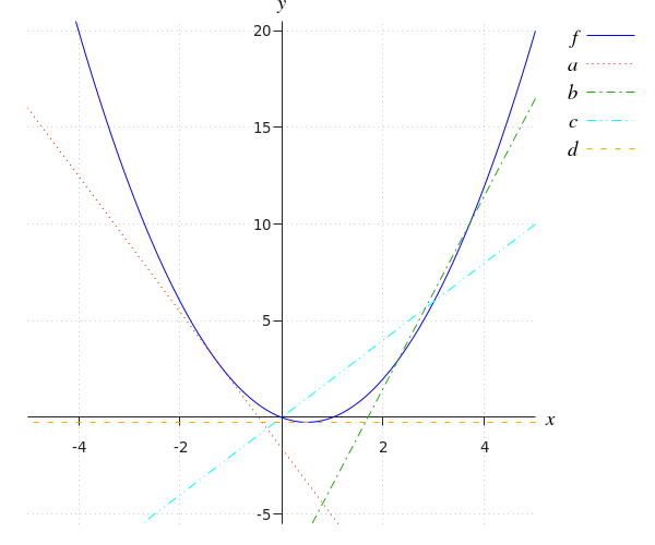 If we take a smaller #\green{h}#, we see that line #\orange{k}# around point #\blue{a}# is increasingly similar to the graph.