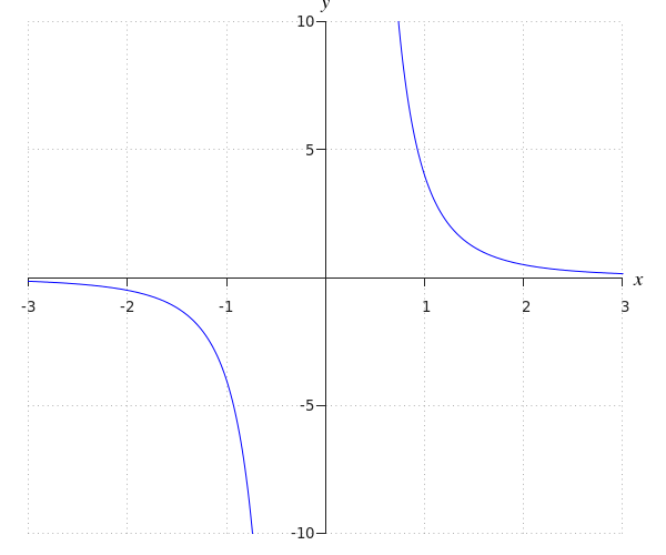 Fíjate en la gráfica de una función de potencia con exponente negativo de la forma #f(x)=\frac{a}{x^n}#.