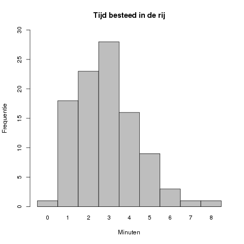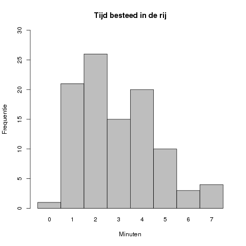 In dit geval ligt de piek van de grafiek bij #2# minuten, met een geobserveerde frequentie van #26#.