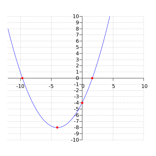 Stap 1 | Het snijpunt met de #y#-as is gelijk aan de waarde van de constante in de kwadratische formule, dus gelijk aan #-4#. De coördinaten van het snijpunt met de #y#-as zijn dus #\rv{0,-4}#. |