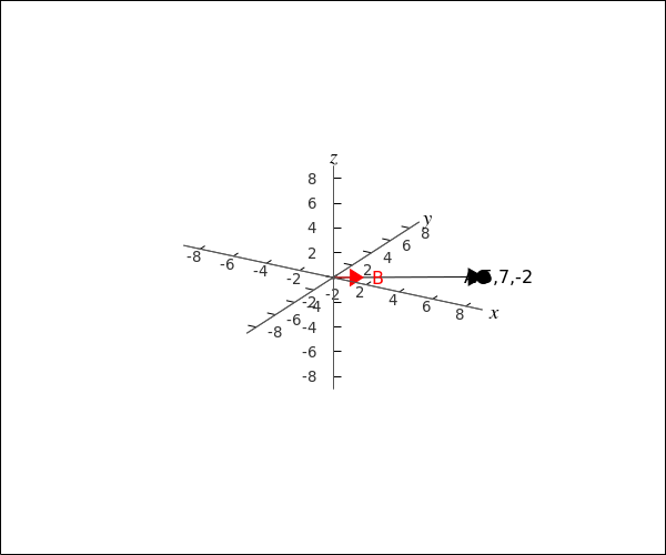 &=&\left[ 1 , {{7}\over{5}} , -{{2}\over{5}} \right]\end{array}\]In de figuur hieronder is #\vec{v}# het zwart getekende lijnstuk van de oorsprong naar #A# en #r\cdot \vec{v}# het rood getekende lijnstuk van de oorsprong naar #B#.